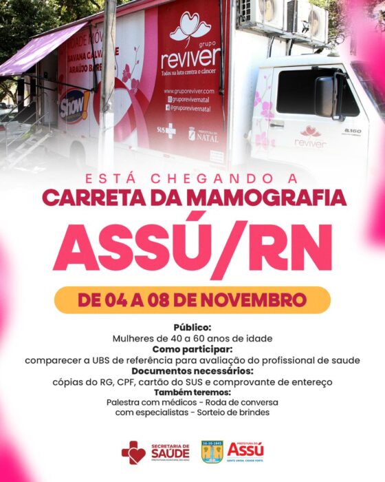 A Prefeitura do Assú, por meio da Secretaria de Saúde, traz à cidade a Carreta do Grupo Reviver em alusão ao Outubro Rosa no cuidado à saúde da mulher.