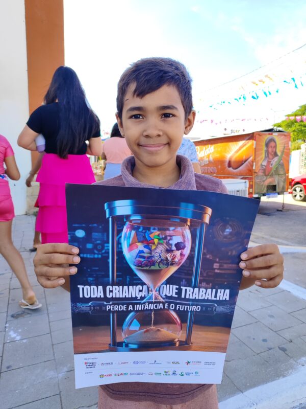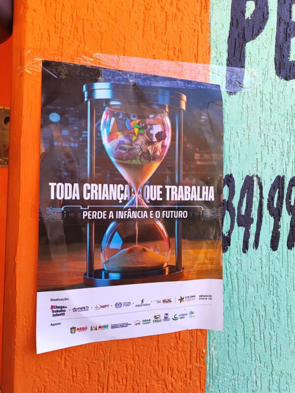 A atividade teve como objetivo alertar a população sobre os riscos e impactos do trabalho infantil, além de reforçar os canais de denúncia. Durante a manhã, foram distribuídos panfletos informativos e fixados cartazes em prédios do comércio local, levando a mensagem de combate a essa grave violação de direitos.