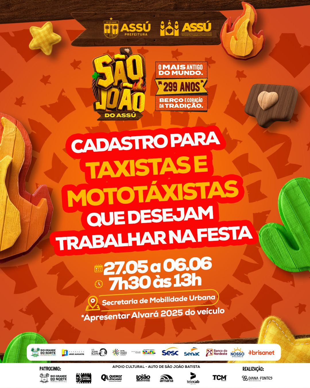 A Prefeitura do Assú, por meio da Secretaria de Mobilidade Urbana, iniciará nesta segunda-feira (27) o cadastramento de taxistas e mototaxistas interessados em trabalhar durante os festejos do São João de Assú, o mais antigo do mundo, que este ano celebra 299 anos de tradição. O atendimento segue até o dia 6 de junho, sempre das 7h30 às 13h, na sede da Secretaria. Para o cadastro, é necessário apresentar o alvará 2025 do veículo.