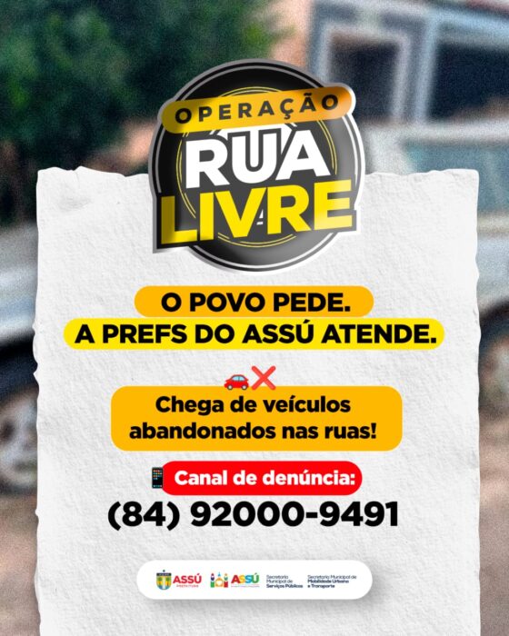 A Operação Rua Livre, iniciada na última terça-feira (25), segue avançando pelas ruas de Assú com ações integradas entre a Secretaria de Serviços Públicos e a Secretaria de Mobilidade Urbana e Transporte. O objetivo é claro: remover carcaças e veículos abandonados que ocupam irregularmente vias públicas e calçadas, garantindo mais segurança, mobilidade e organização para a cidade.