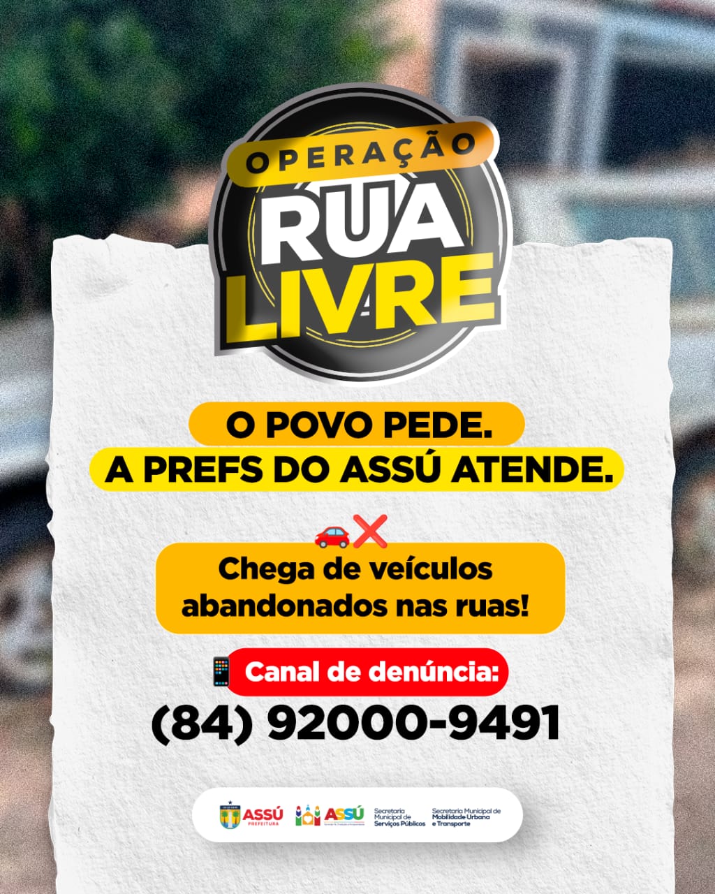 E o pedido foi atendido. A Secretaria de Mobilidade Urbana e Transporte colocou à disposição da população um número de WhatsApp para receber denúncias de veículos que estejam obstruindo ruas ou causando transtornos. O número é o: (84) 92000-9491