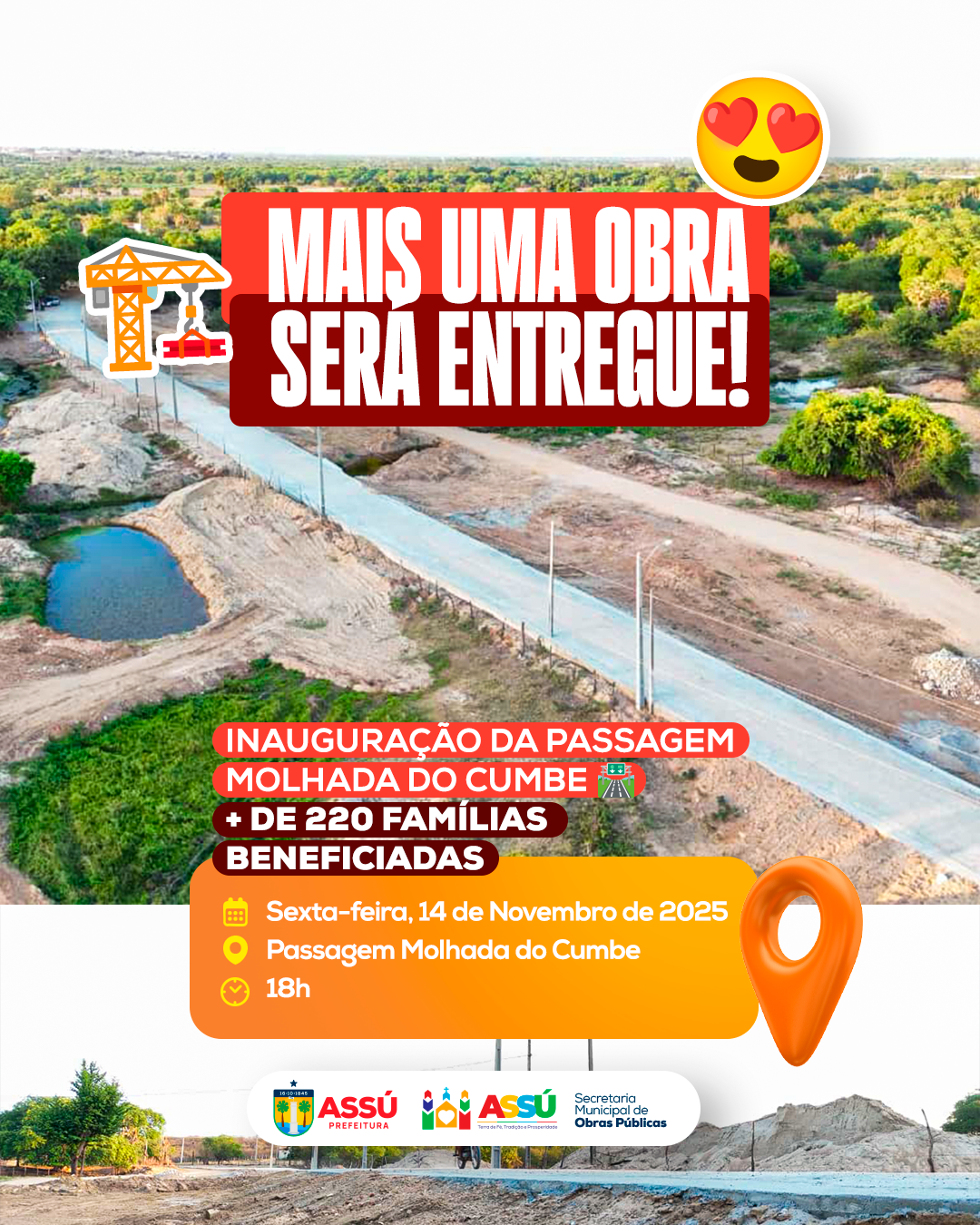 A Prefeitura Municipal do Assú realiza nesta sexta-feira, 14 de novembro, às 18h, a inauguração oficial da Passagem Molhada do Cumbe. A obra representa um antigo sonho da comunidade, e passa a garantir mobilidade com segurança para dezenas de famílias que dependem daquele trecho diariamente.