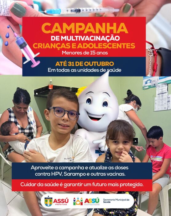 A Campanha de Multivacinação já começou em Assú! Até o dia 31 de outubro, crianças e adolescentes menores de 15 anos podem atualizar suas vacinas em todas as Unidades Básicas de Saúde (UBSs) do município.