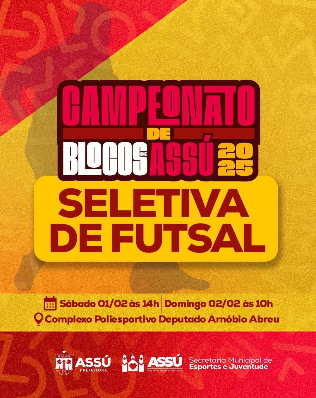 O esquenta do Campeonato de Blocos do Carnaval de Assú 2025 já vai começar! Neste sábado (1), às 14h, e domingo (2) às 10h, acontece a seletiva do futsal masculino, uma ação da Prefeitura de Assú, através da Secretaria de Esporte e Juventude.